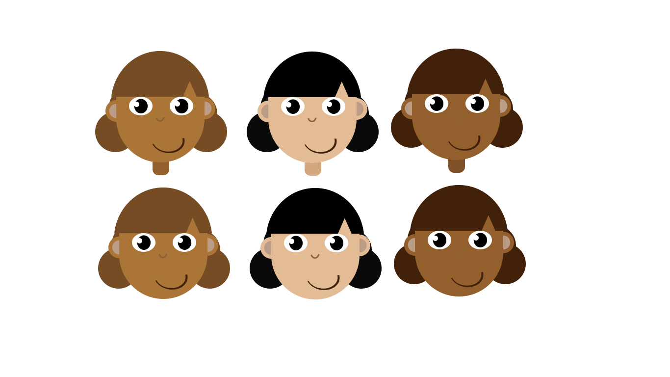 This features a group of six girls, each with different colored skin and hair. They are all smiling at the camera, creating an adorable and friendly atmosphere. Each girl is positioned in a row, showcasing their unique appearances while maintaining a sense of unity through their shared expressions. This delightful scene captures the essence of childhood innocence and camaraderie among friends or siblings.