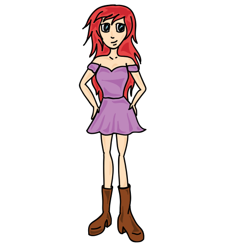 This features a cartoon drawing of a woman wearing a purple dress and boots. She has long red hair, green eyes, and is standing with her hands on her hips. Her outfit appears to be stylish and well-coordinated, adding an element of sophistication to the overall appearance. The cartoon style of the drawing gives it a unique and playful quality, making it an interesting visual piece that captures the viewer's attention.