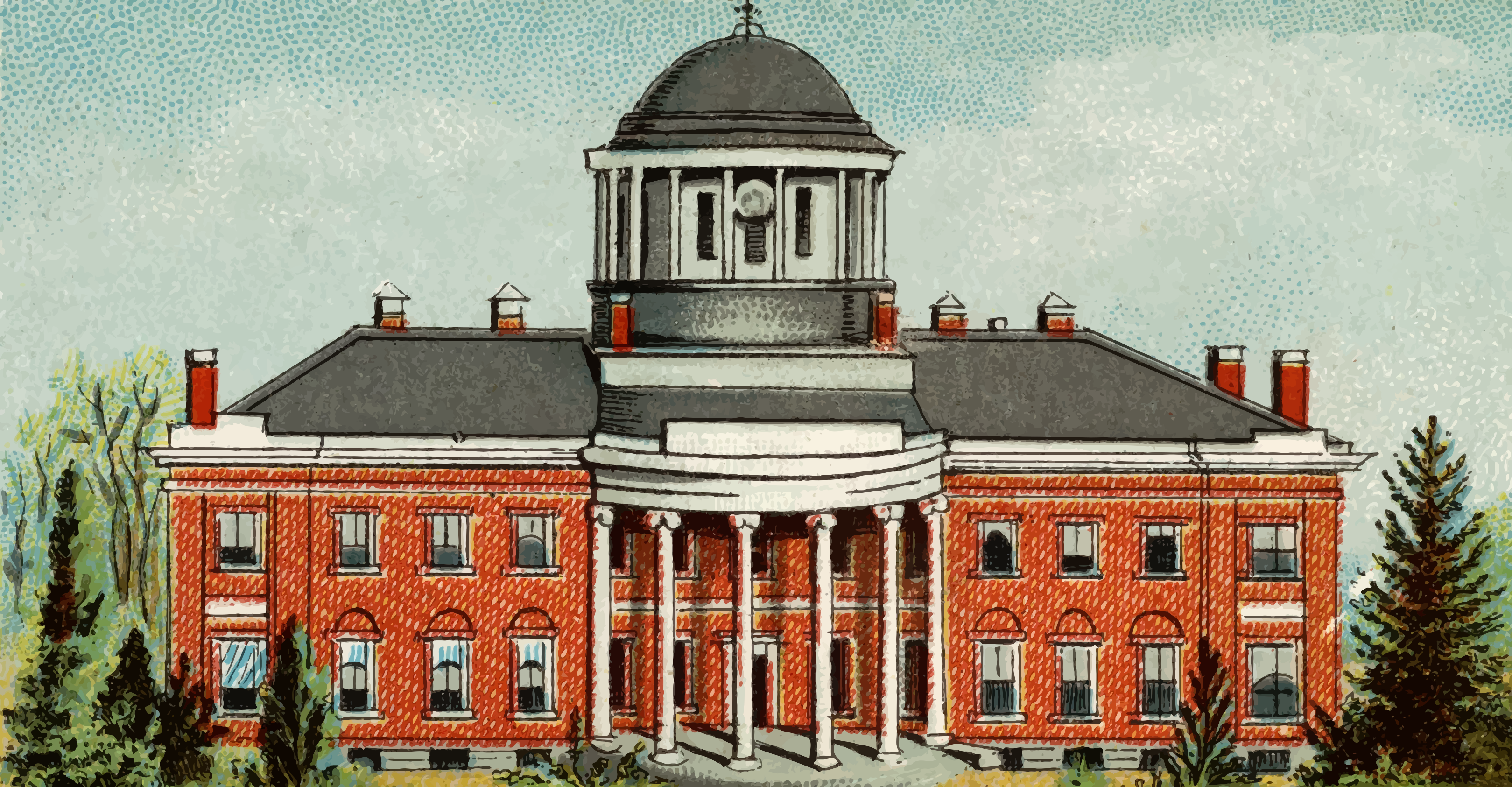 This features a large, red brick building with white trim and a black roof. It has a prominent clock tower on top of the structure, adding to its grandeur. The building is surrounded by trees, giving it an inviting atmosphere. There are several windows throughout the building, some of which have shutters, while others do not. A bench can be seen in front of the building, providing a place for people to sit and enjoy the surroundings.