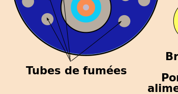 This features a blue circle with an orange center, which is labeled as "tubes de fumées" in French. There are several dots surrounding the central orange area, and some of these dots are also colored blue. The overall scene appears to be a diagram or illustration related to tubes and their connection to smoking.