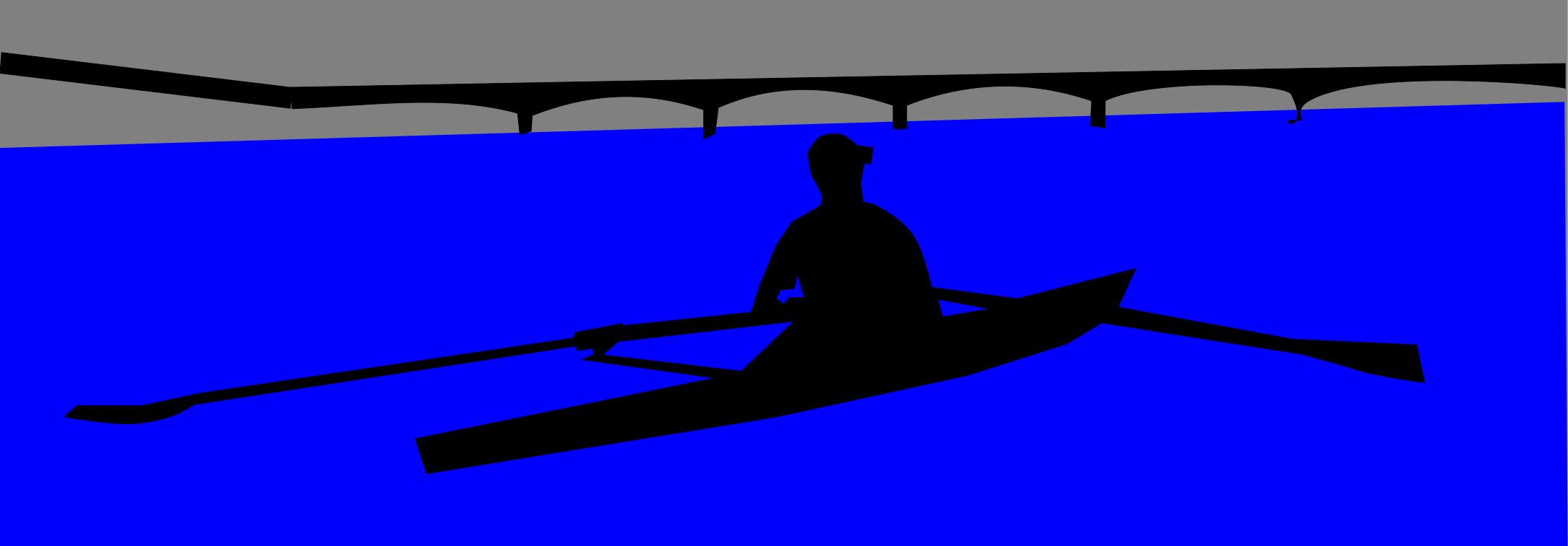 This features a man in a boat on the water. He is rowing with one oar, and his body is facing away from the viewer. The boat appears to be a canoe or kayak, as it has a single paddle. The scene takes place near a bridge, which adds an interesting architectural element to the background. The man's position in the boat suggests that he might be enjoying some leisurely time on the water, possibly exploring the surrounding area or simply taking in the scenery.