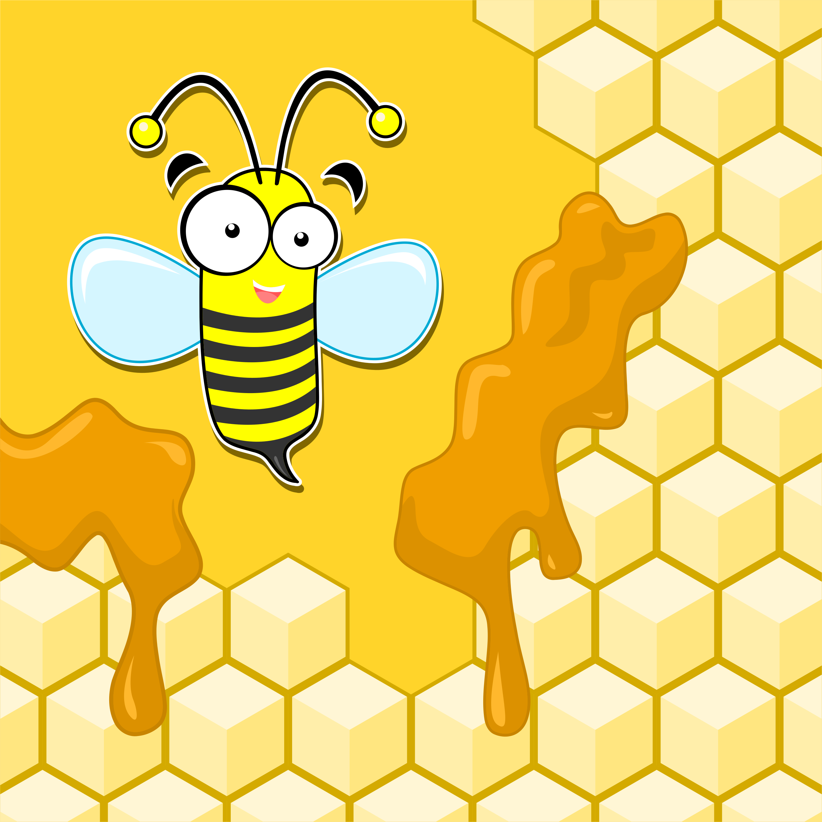 This features a cartoon bee with a yellow background, standing in front of a honeycomb. The bee is positioned towards the left side of the frame and appears to be guarding the honey. There are several chunks of candy or honey scattered around the scene, adding to the playful atmosphere. Some of these pieces can be found near the top right corner, while others are located in the middle and bottom right areas of the image. The overall composition creates a fun and engaging visual experience for viewers.