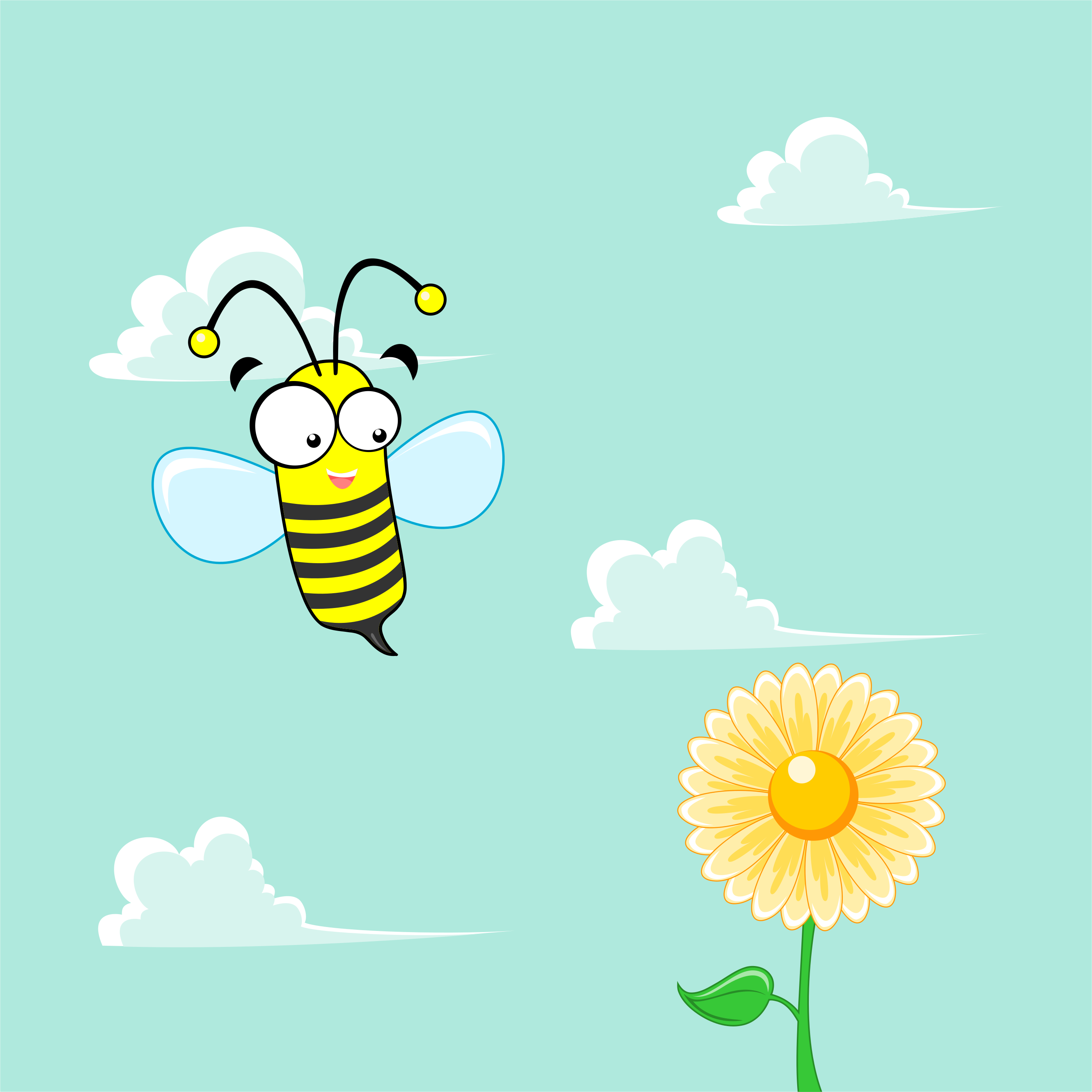 This features a yellow and black bee flying through the sky, with its attention focused on a single yellow flower. The bee is positioned in the upper left portion of the scene, while the flower takes up most of the right side of the frame. The bee appears to be enjoying the sight of the flower as it flies by.