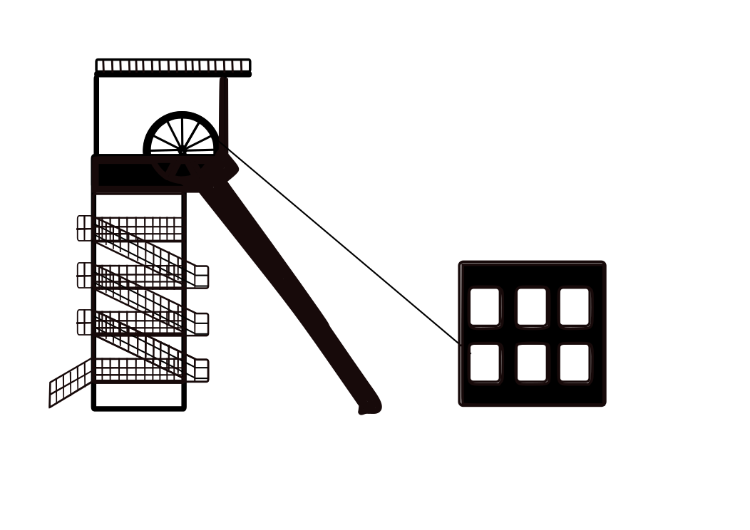 This features a black and white drawing of an old-fashioned crane, with a large wheel at the top. Above the crane, there is a small window or square that appears to be connected to it by a string. This unique design gives the impression that the crane is being controlled from inside the building through this connection. The drawing captures the essence of an old-fashioned machine and its intricate mechanism, making for an interesting visual representation.