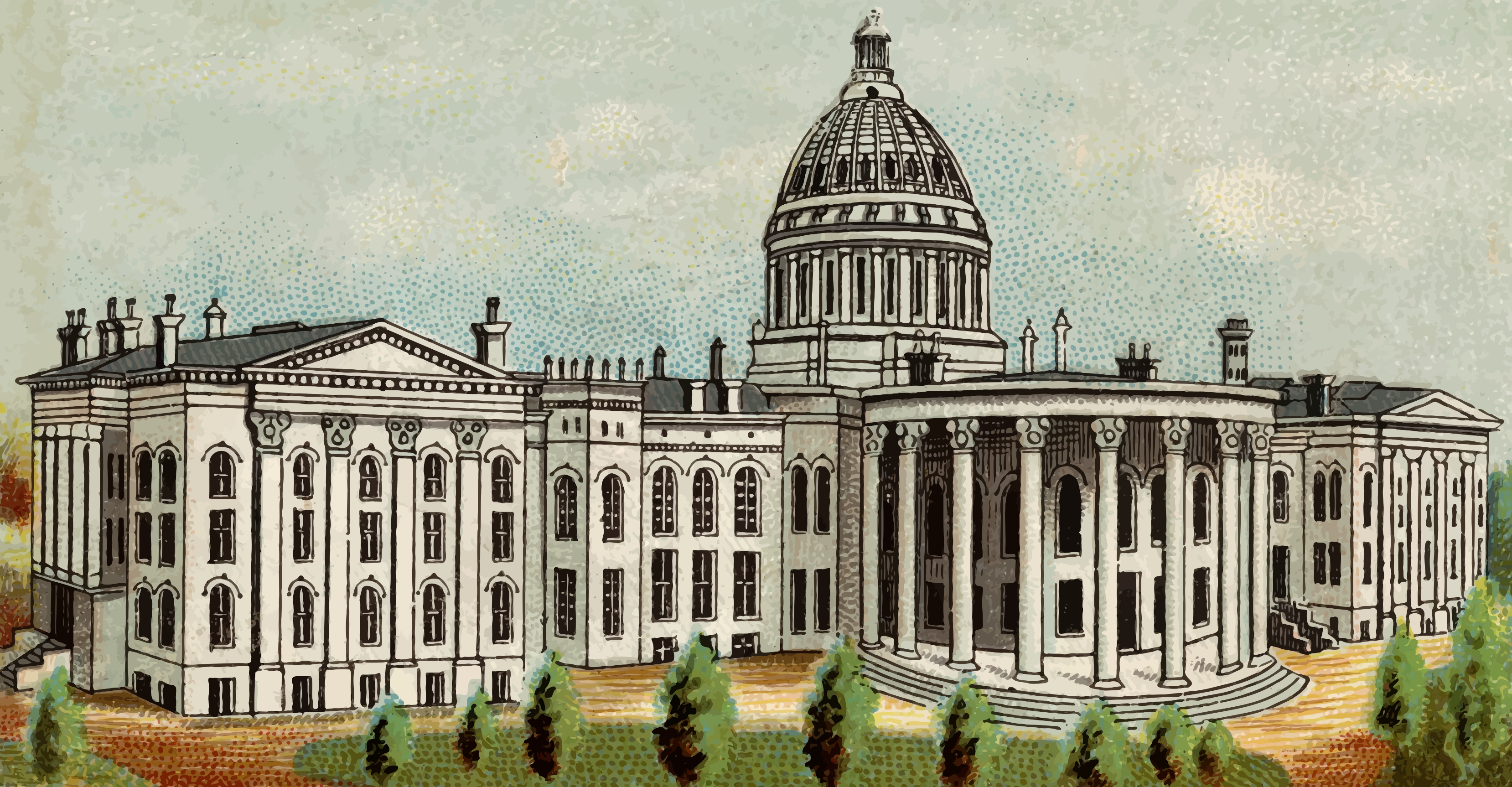 This features a large, ornate building with a dome on top. This building appears to be an old and historic structure, possibly a government building or a university. There are several trees surrounding the building, adding greenery to the scene. In addition to the main building, there is another smaller building located in the background. The overall atmosphere of the image suggests that it could be a painting or drawing of this impressive architectural landmark.