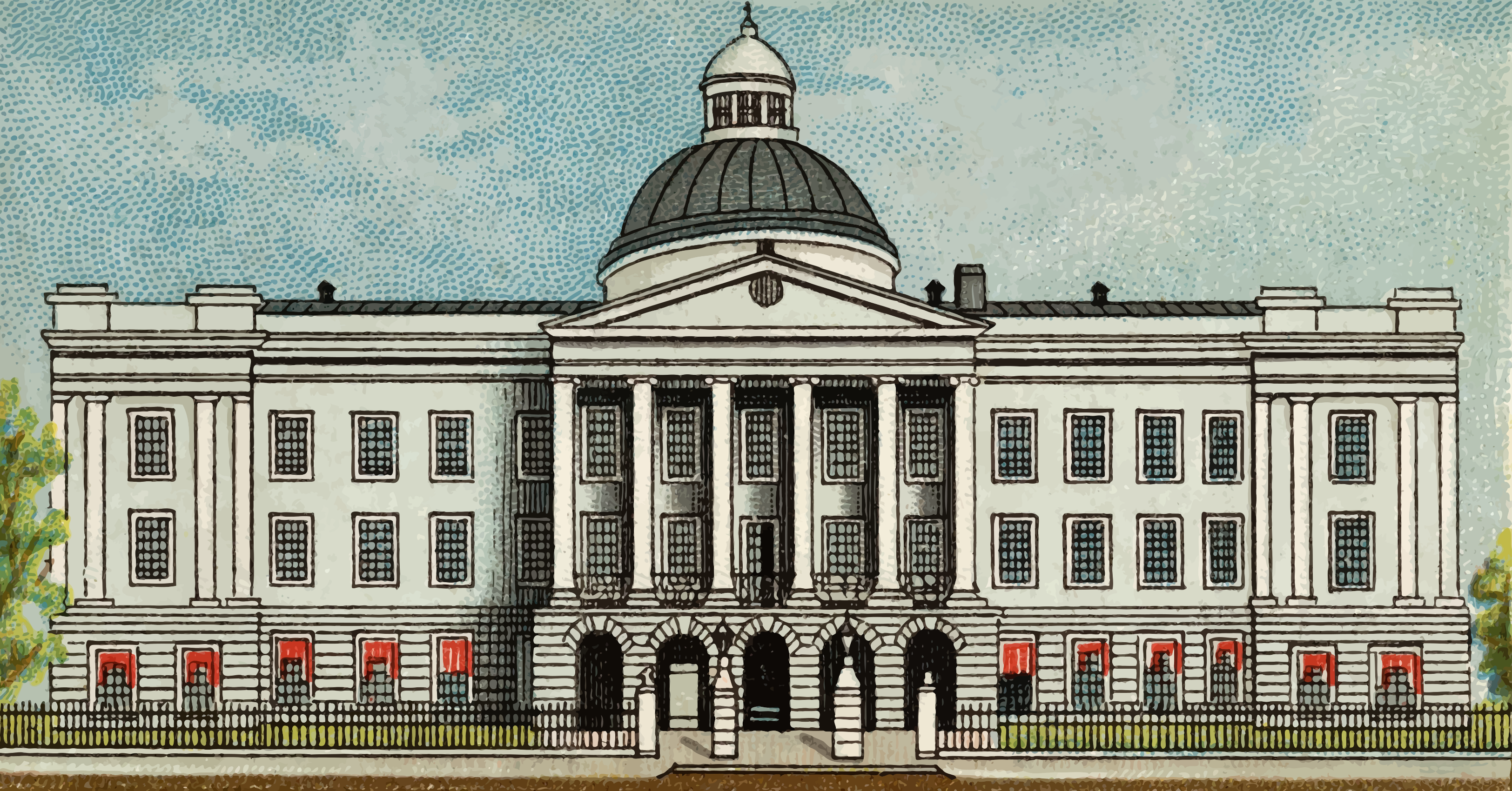 This features a large, white building with a prominent dome on top. This building appears to be an old university or government building, as it has many windows and is surrounded by a fence. There are several columns lining the front of the building, adding to its grandeur. In addition to the main building, there are two smaller buildings visible in the background, one located on the left side and another further back on the right side. The overall scene gives off an impression of historical significance and architectural beauty.