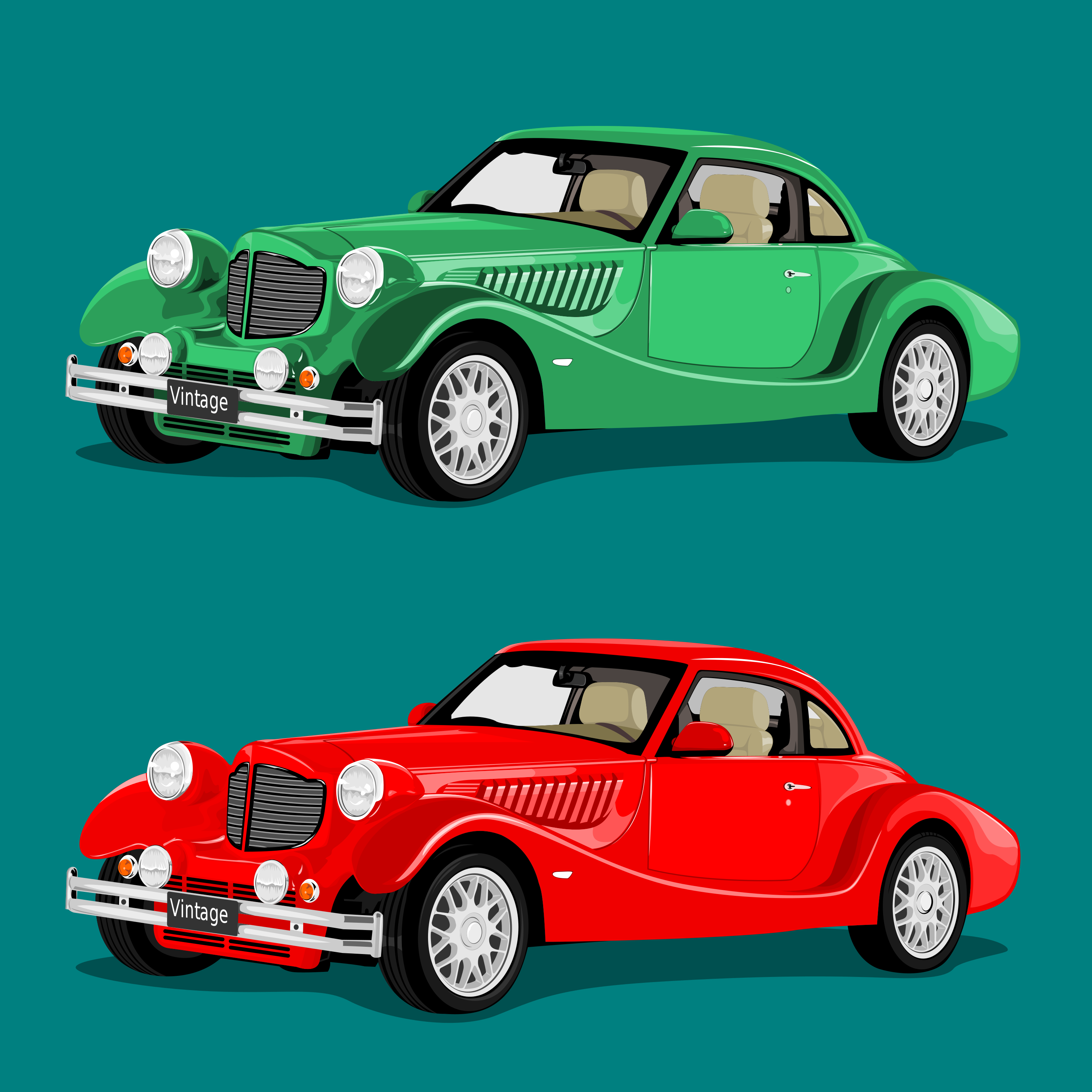 This features two cars, one green and the other red. Both cars are vintage models with a classic design. They appear to be parked next to each other on a blue background, which adds a contrasting element to the scene. The green car is positioned towards the left side of the image, while the red car is located more towards the right. These two vehicles evoke a sense of nostalgia and showcase the beauty of classic automobiles.