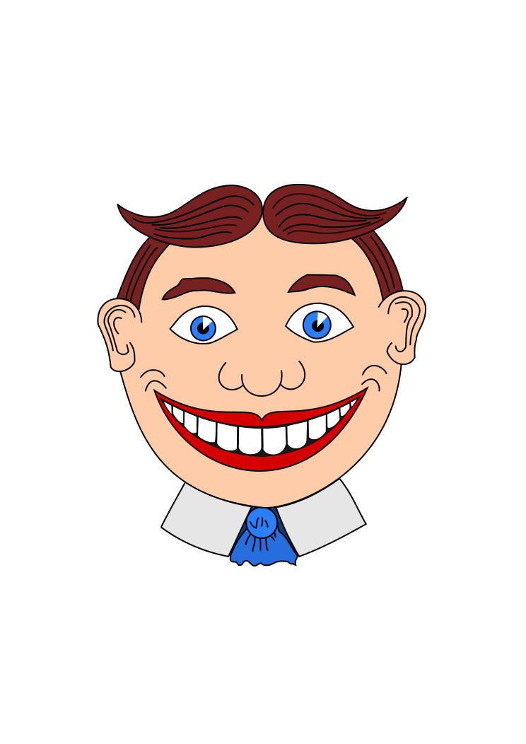 This features a cartoon drawing of a man with a blue shirt and white collar. He is wearing a tie, which has a blue bowtie on it. The man's face is painted in red and blue colors, giving him a unique appearance. His mouth is open wide, showing off his teeth as he smiles for the camera. This drawing could be an illustration or a character from a comic book or other form of entertainment.