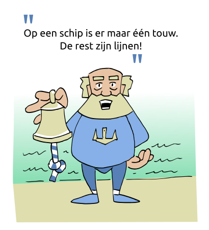 This features a cartoon character, possibly an old man or a bearded sea captain, holding a bell in his hand. He is wearing blue clothing and appears to be standing on the beach. The character seems to be making a statement with the phrase "Opp een schip is er maar een en wie" written above him. This phrase can be translated as "There's only one ship, but who?" or "Only one ship, but who?", which adds an interesting element of mystery to the scene. The character seems to be engaging with the viewer and inviting them to ponder the meaning behind his statement.