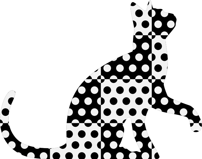 This features a black and white cat with polka dots, standing on the ground. It appears to be walking or running across the scene, creating an interesting visual effect. The cat's body is covered in a pattern of black and white circles, giving it a unique appearance. The background of the image is a solid color, which contrasts well with the cat's polka dotted fur. Overall, this image captures the playful nature of cats and their ability to create visually engaging patterns through their fur.