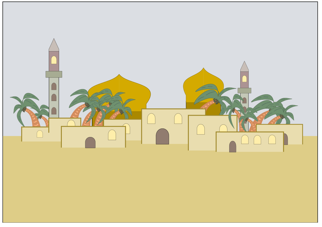 This features a desert landscape with a fortress made of sand and stone. The fortress is adorned with several buildings, including towers that resemble mosques. These towers are decorated with palm trees, adding an exotic touch to the scene. In total, there are five visible palm trees surrounding the fortress, some closer to the buildings and others further away. The sky in the background is a light shade of blue-gray, creating a serene atmosphere for this desert landscape.
