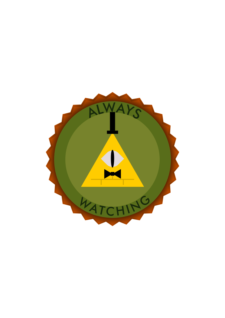 This features a green and yellow circle with the words "always watching" written in white. Inside this circle, there is an eye symbol that appears to be a triangle. This design gives off a sense of being constantly monitored or watched over. The color scheme of the circle consists of green for the background and yellow for the writing, creating a visually striking contrast.
