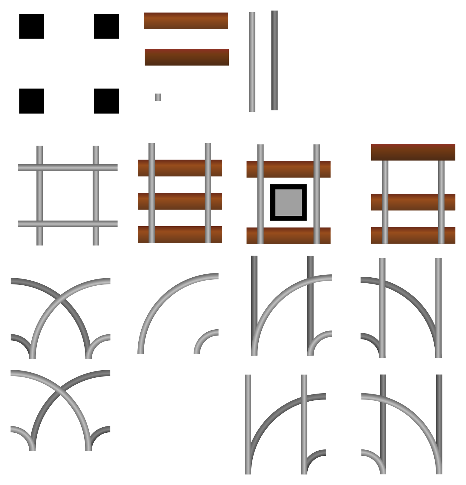This is a collection of various types of railings, including metal and wooden ones. There are several different shapes and sizes of railings displayed in the picture. Some of these railings have a more modern appearance while others have a more traditional look. The railings are arranged in an organized manner, with some placed next to each other and others overlapping or stacked on top of one another. This collection showcases a variety of design options for those looking to incorporate railings into their projects.