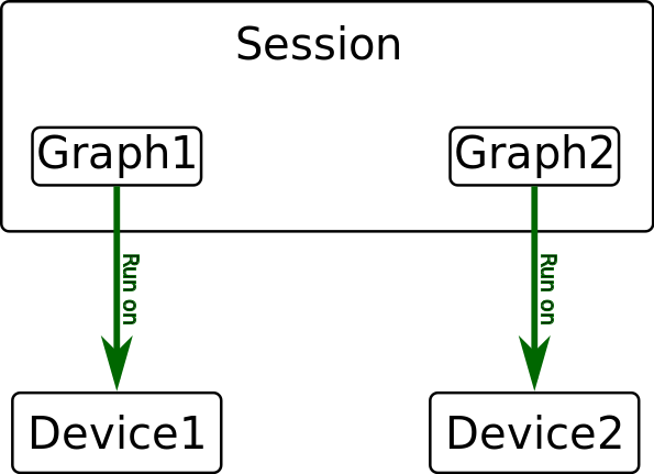 This displays a diagram with several different sections labeled. In the top left corner, there is a section titled "Session." Below that, there are three sections labeled "Graph 1," "Graph 2," and "Graph 3." Each of these sections has a green arrow pointing to them, indicating their relationship within the overall diagram. Below the "Graph" sections, there are two more sections: "Device 1" and "Device 2." These sections have labels underneath them, suggesting that they might be related to the devices in the graph section above. The image appears to depict a complex system or process with multiple interconnected components.