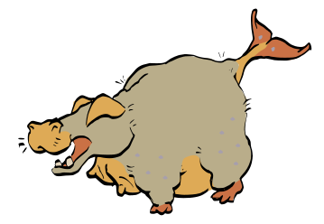 This features a cartoon-like animal with an elongated body and a long tail. It appears to be a creature that is part mouse, part elephant, and has a whale's tail. This unique character seems to be in motion as it walks across the screen. The drawing showcases the animal's distinctive features, including its large ears and mouth, which are open wide. The overall appearance of this creature gives off an amusing and playful vibe.
