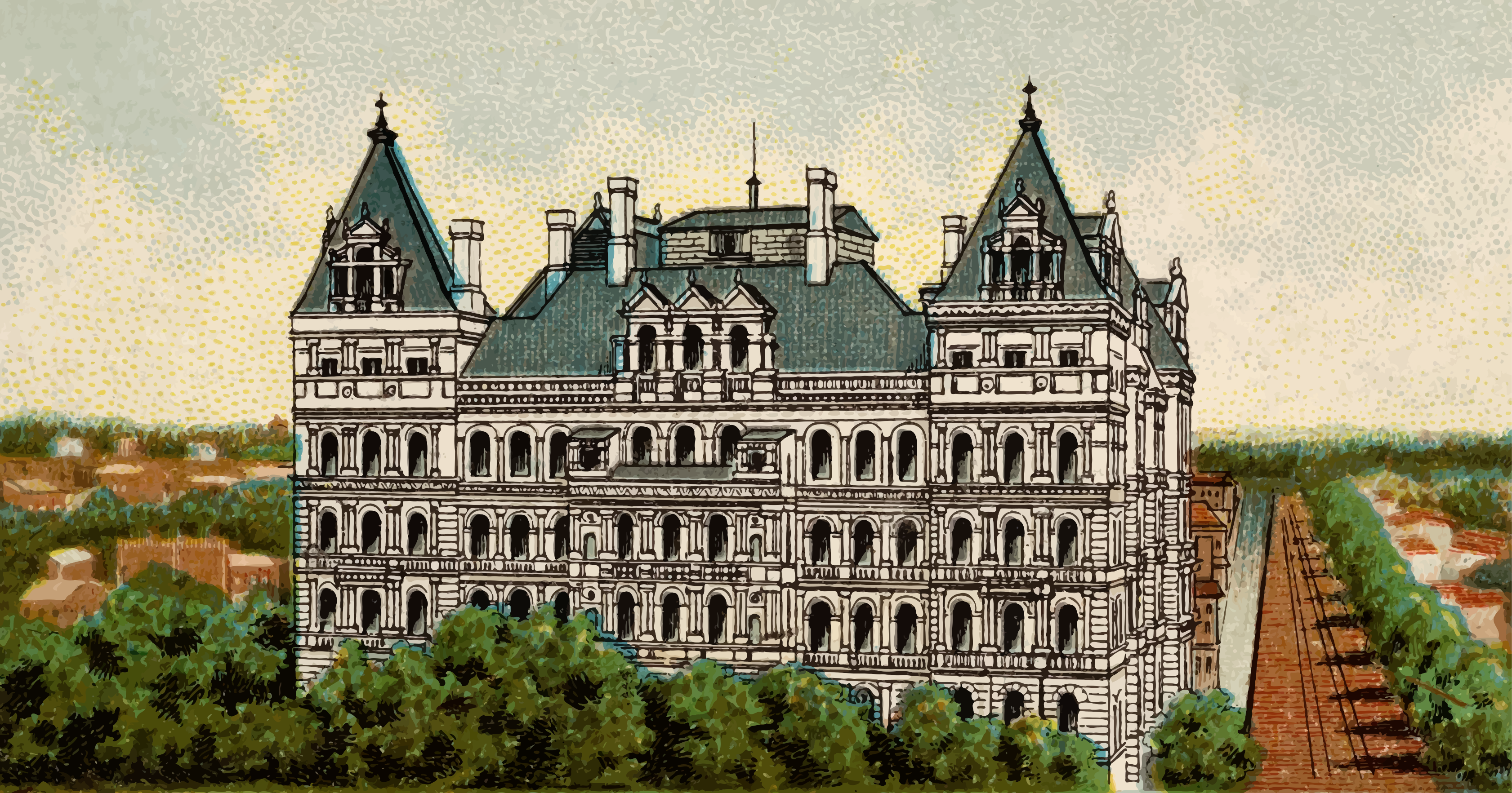 This features a large, ornate building with many windows and towers. It appears to be an old castle-like structure, possibly made of stone or brick. The building is situated on top of a hill, overlooking the surrounding area. In addition to the main building, there are several smaller structures nearby, including trees and a bridge that spans across the landscape. The overall scene gives off a sense of grandeur and historical significance.