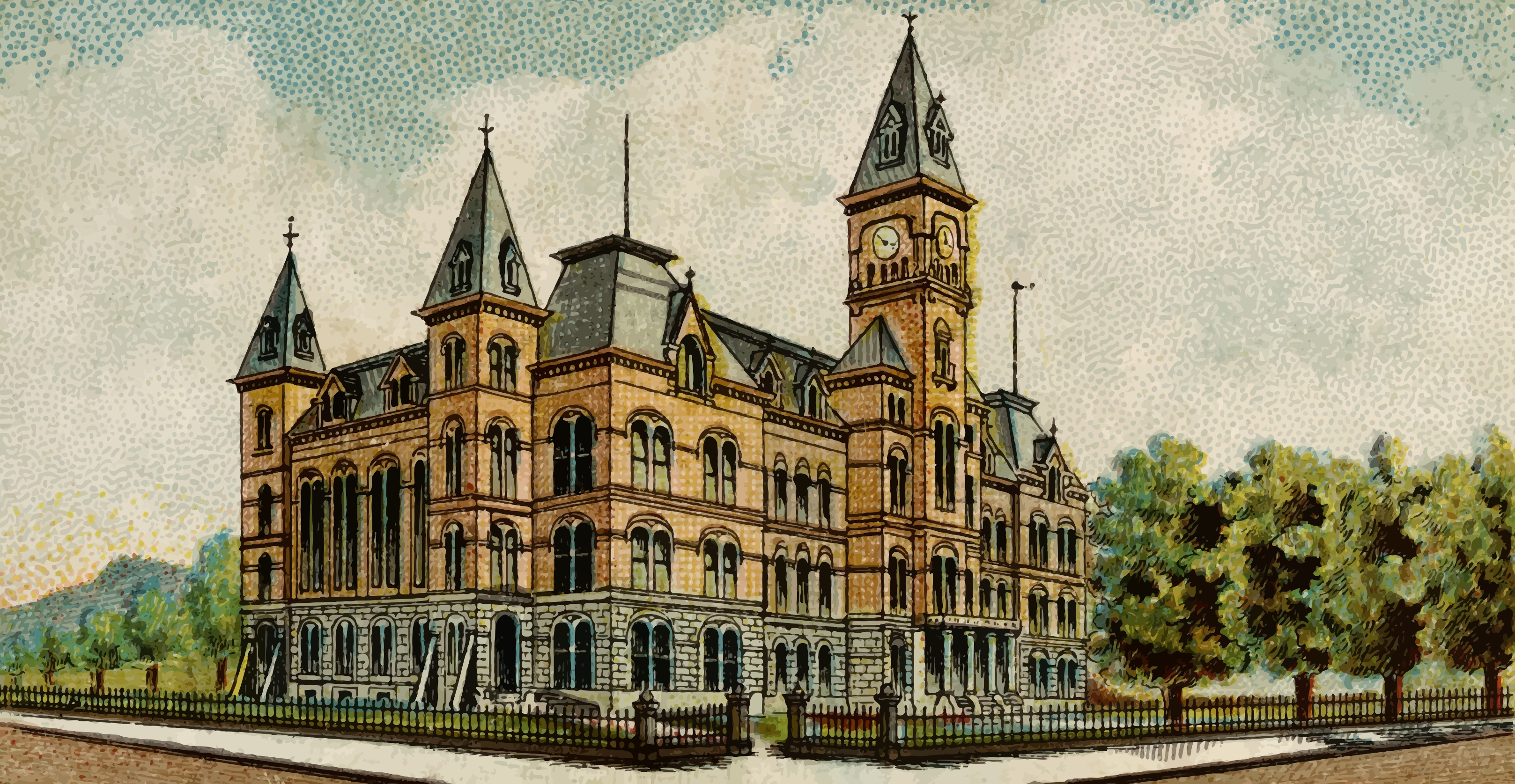 This features a large, old-fashioned building with a clock tower on top. The building has a distinctive red brick exterior and is surrounded by trees, giving it an elegant appearance. There are several windows along the sides of the building, adding to its architectural charm. A fence can be seen in front of the building, providing a sense of security for the property. Additionally, there are two benches located near the building, offering a place for people to sit and enjoy the surroundings.