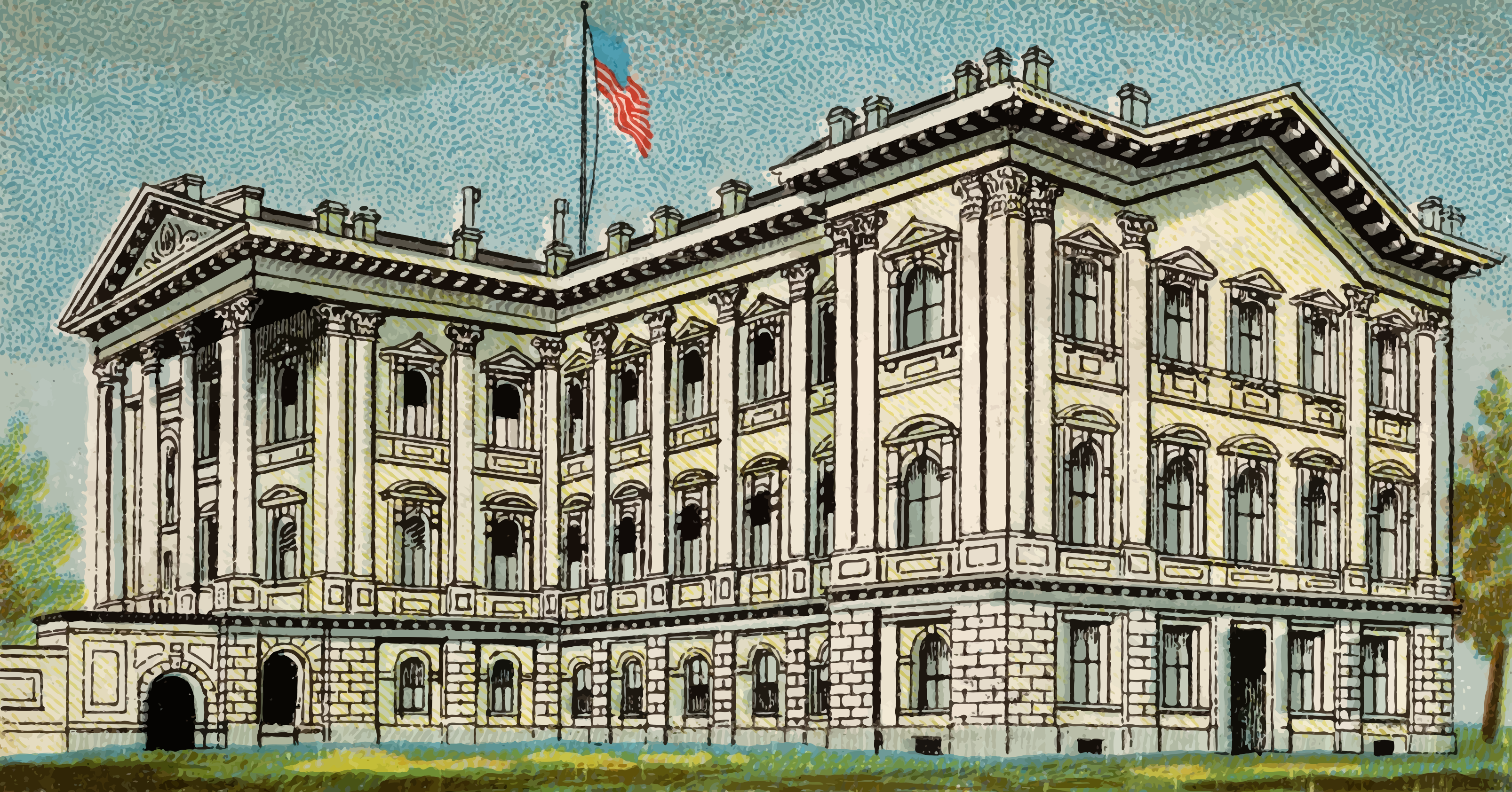 This features a large, white building with many windows and columns. A prominent American flag is flying on top of the building, adding to its grandeur. The building appears to be an old, historical structure that has been well-maintained over time. It stands tall in front of a tree, creating a picturesque scene. The architectural details of the building are intricate and impressive, making it an attractive sight for anyone who appreciates history or architecture.