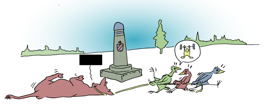 This features a group of animals, including two dogs and three cats, gathered around a monument. One dog is lying on the ground next to another dog that appears to be dead or sleeping. A cat can also be seen lying down near the monument. In addition to these animals, there are several birds scattered throughout the scene, with some perched on the monument and others flying in the sky. The overall atmosphere of the image is quite lively, as the various animals interact with each other and their surroundings.