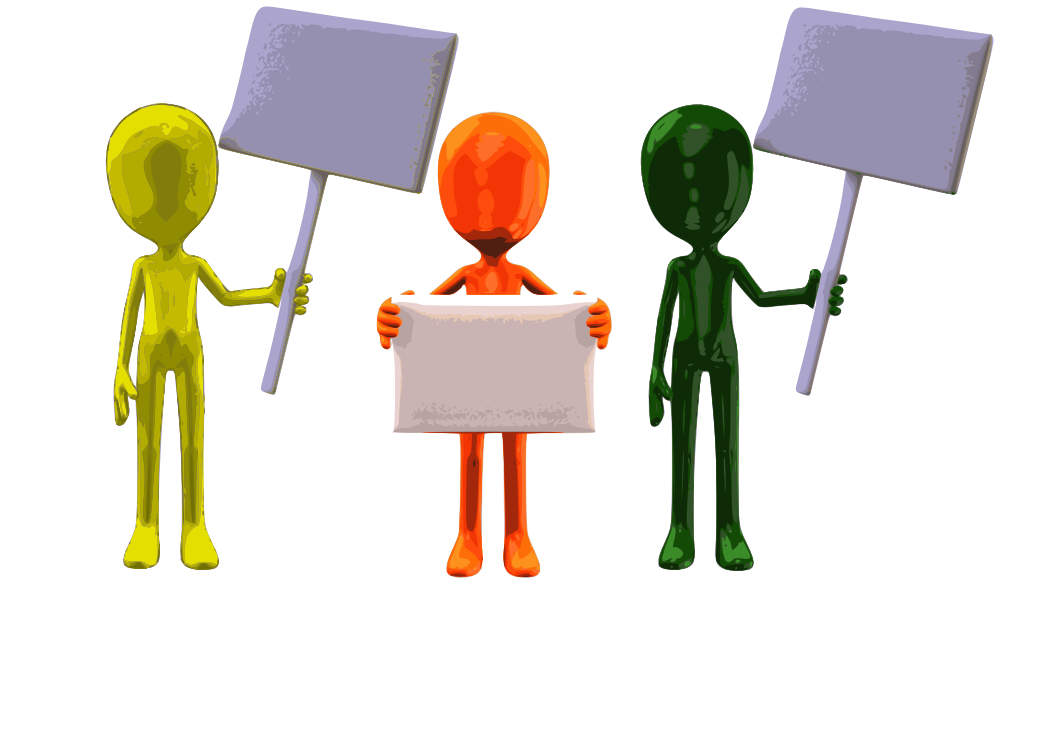 This features three cartoon characters holding up signs. Each character is distinctly colored, with one being yellow, another orange, and the third green. They are standing next to each other in a row, displaying their signs prominently. The signs appear to be related to protesting or advocating for something, as they hold them high above their heads. The cartoon characters seem to be engaged in a collective effort to convey their message through these signs.