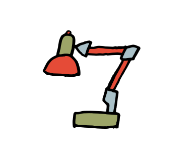 This features a cartoon drawing of an old-fashioned lamp with a red shade. It is sitting on top of a table, and the lamp has a unique design that includes a metal arm extending outwards. This creative representation of a lamp adds a touch of whimsy to the scene.