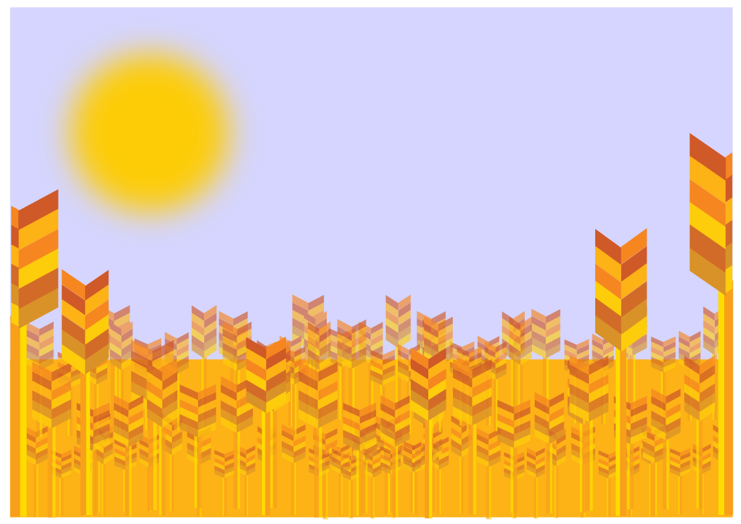 This features a beautiful sunset with the sun shining brightly in the sky. The scene is set against a backdrop of tall, golden grasses that stretch out towards the horizon. These grasses are arranged in rows and create an impression of a cityscape. The overall atmosphere of the picture is serene and picturesque, capturing the essence of nature's beauty during sunset hours.