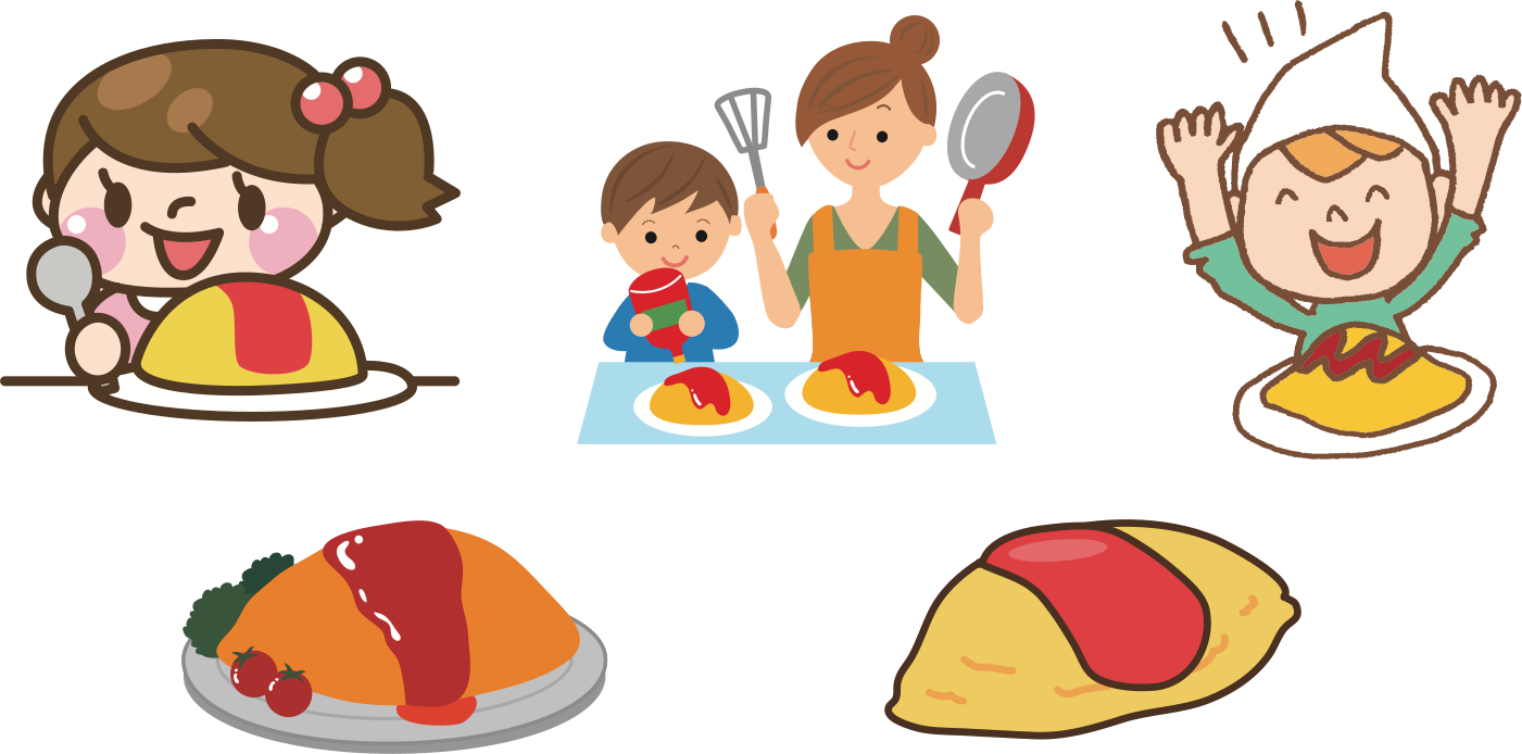 This features a collection of four different cartoon illustrations, each depicting a woman and a child cooking together. In one scene, the woman is holding a spatula while the child holds a spoon, both engaged in preparing food. Another illustration shows the woman using a knife to cut into a pizza, with the child nearby. The third image features the woman and child standing next to each other, cooking together. Lastly, the fourth scene showcases the woman holding a bowl of food while the child is laughing in the background. Each illustration captures the joyful atmosphere of cooking with children.