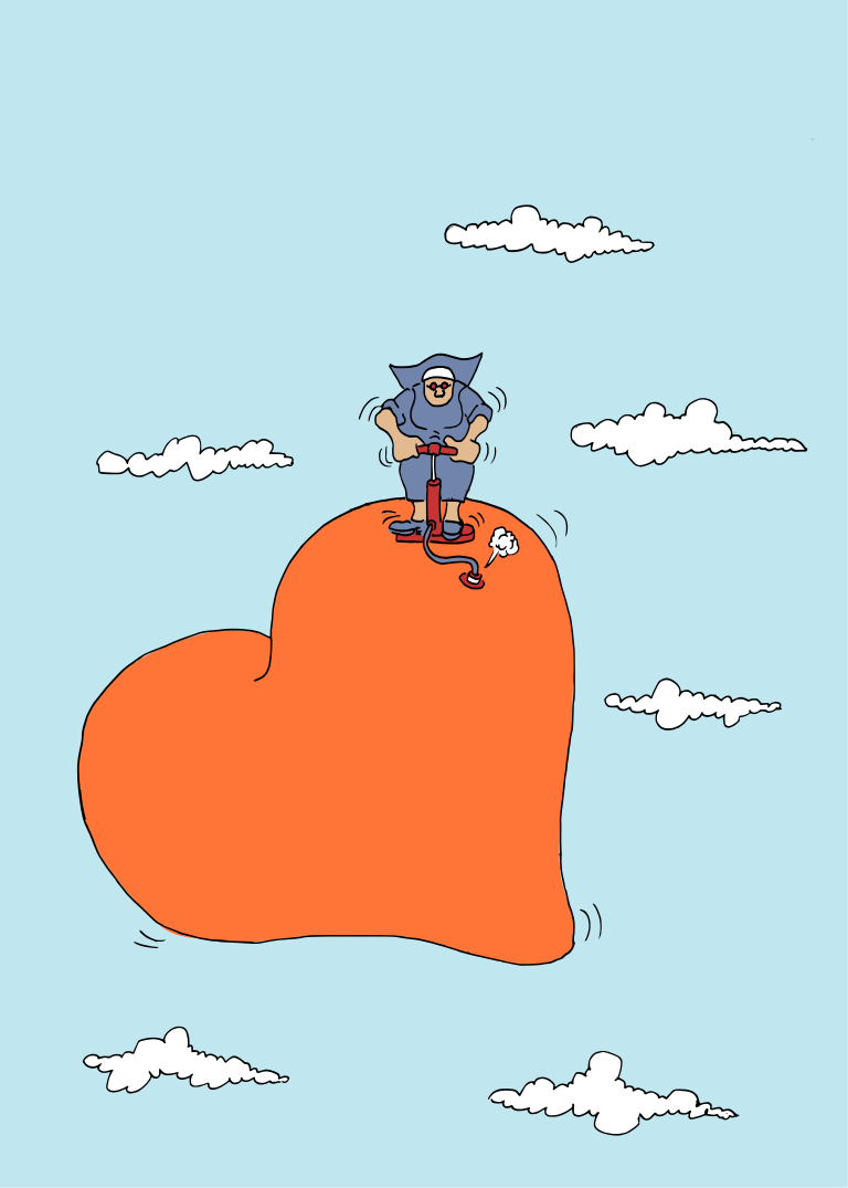 This features a cartoon character, possibly a man or a dog, sitting on top of an orange heart-shaped cloud. This whimsical scene is set against a backdrop of blue skies and white clouds, creating a playful atmosphere. The character appears to be enjoying their time on the heart, which adds a sense of fun and adventure to the image.