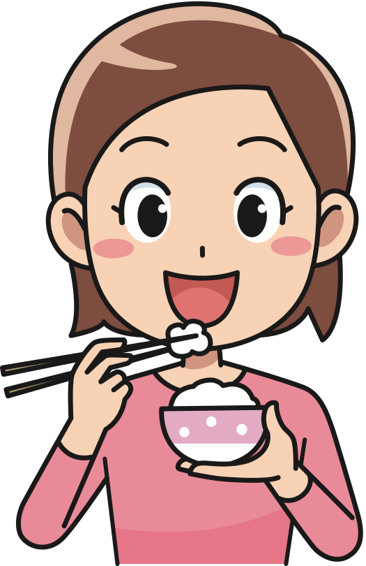 This features a cartoon woman with brown hair, wearing a pink shirt and holding a bowl of rice. She is in the process of eating her meal, as she holds two chopsticks raised to her mouth. Her facial expression appears to be happy and content while enjoying her food. The scene captures a casual and fun atmosphere with the woman being the main focus of the image.