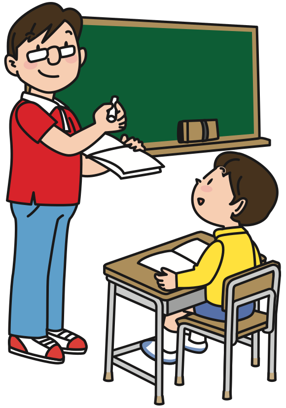 This features a teacher standing in front of a chalkboard, teaching a young student. The teacher is wearing glasses and has his hand on the board while talking to the child. The child appears attentive as they listen to their teacher. They are both seated at a desk with books placed nearby. A chair can be seen in front of the desk, likely for the child to sit on during class.