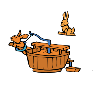 This features a creative scene with two rabbits, one of which is tied to an orange hand mill. The other rabbit appears to be sitting on top of the mill, creating a playful and whimsical atmosphere. The hand mill itself has a wooden appearance, adding to the charm of the scene. This imaginative portrayal showcases the rabbits interacting with a common household item in an unconventional manner, making it an interesting visual for viewers.