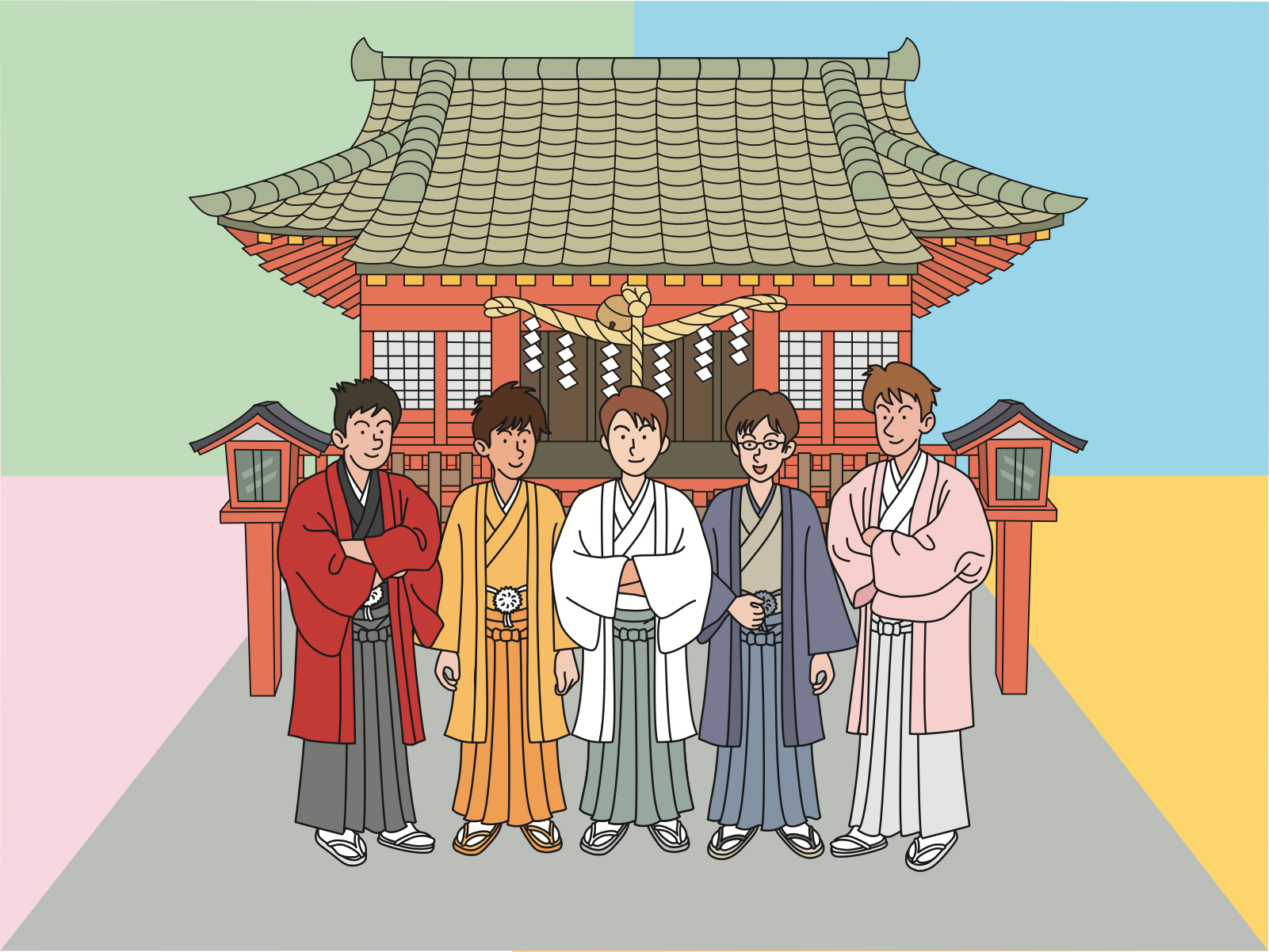 This features a group of five people standing together in front of a building. They are all dressed in traditional Asian clothing, with some wearing kimonos and others donning more formal attire. Each person is posing for the camera, creating an interesting composition that highlights their unique outfits and personalities. The building they are standing in front of appears to be a temple or a similar cultural structure, adding context to the scene.