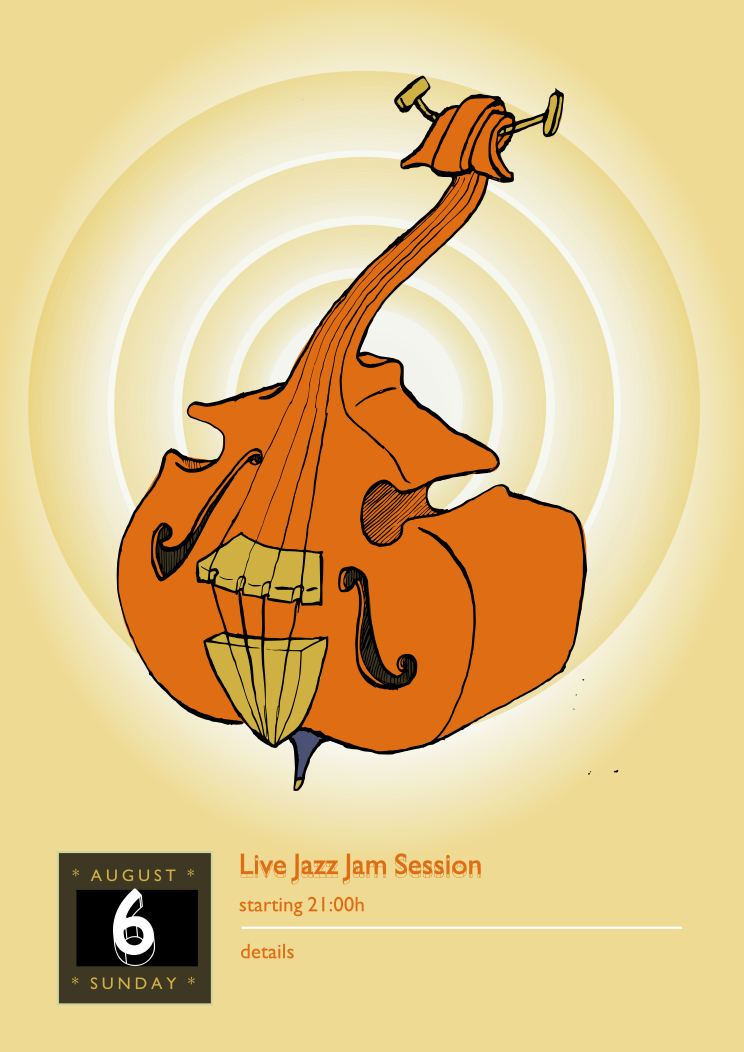 This features a colorful poster advertising an event called "Live Jazz Jam Session." The poster is orange and yellow, with the main focus being on a large illustration of a cello. The cello is prominently displayed in the center of the poster, surrounded by various musical notes that add to its visual appeal. In addition to the cello, there are several other musical instruments depicted throughout the poster, including a violin and a trombone. These instruments are scattered around the main cello illustration, emphasizing the variety of music being showcased at this event. The overall design of the poster is eye-catching and inviting, making it an attractive advertisement for the upcoming jazz jam session.