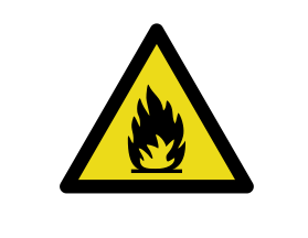This features a yellow and black sign with an orange flame on it. This sign is likely meant to warn people of potential fire hazards or caution them about the use of certain materials that are inflammable. The bright colors of the sign make it easily noticeable, ensuring that individuals can take appropriate precautions when necessary.