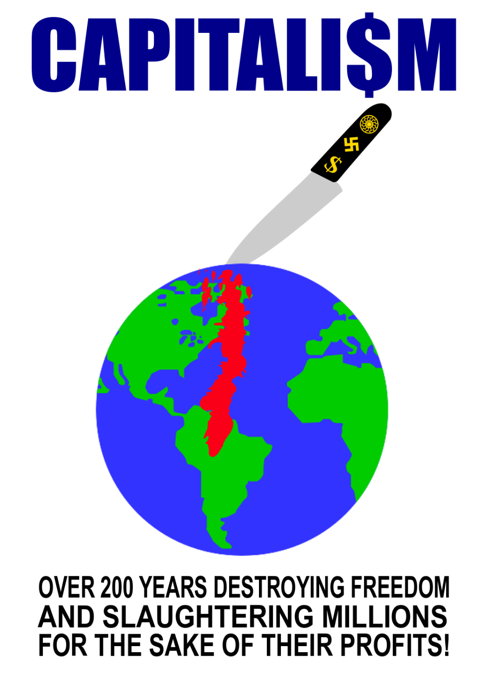 This features a poster that highlights the negative impact of capitalism on society. It shows an illustration of a dollar bill being used to cut into a globe, symbolizing how capitalism is destroying freedom and slaughtering millions for the sake of their profits. The poster also states that this has been happening over 200 years, emphasizing the long-standing issue with capitalism. The visual representation of the dollar bill cutting into the globe serves as a powerful metaphor to convey the message and make it more impactful for viewers.
