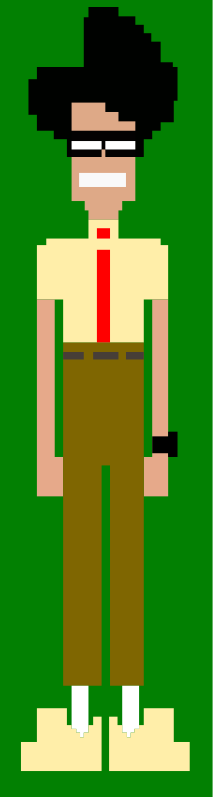 This features a man wearing a tie and brown pants, standing in front of a green background. He appears to be an animated character or a pixelated figure, giving the impression that he is made up of small squares. The man's attire includes a shirt and tie, which adds a formal touch to his appearance. His posture suggests that he might be posing for a picture or simply standing in place. Overall, the image has a unique and interesting visual style due to the combination of the animated character and the green background.