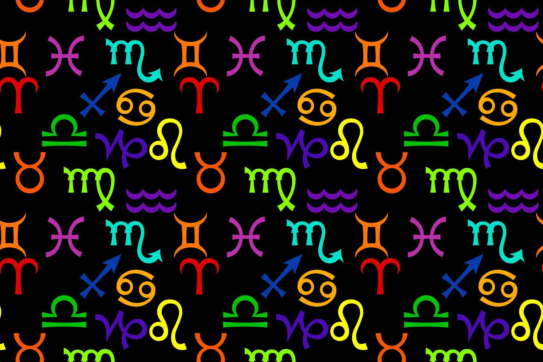 This features a pattern of various zodiac signs, including Aries and Scorpio. These signs are displayed in different colors, such as red, green, blue, yellow, purple, orange, and black. The zodiac signs are arranged in a way that they fill the entire frame, creating an intricate and visually appealing design. This pattern could be used for various purposes, including wallpaper or clothing designs, showcasing one's astrological sign or simply as an artistic expression of the zodiac signs.