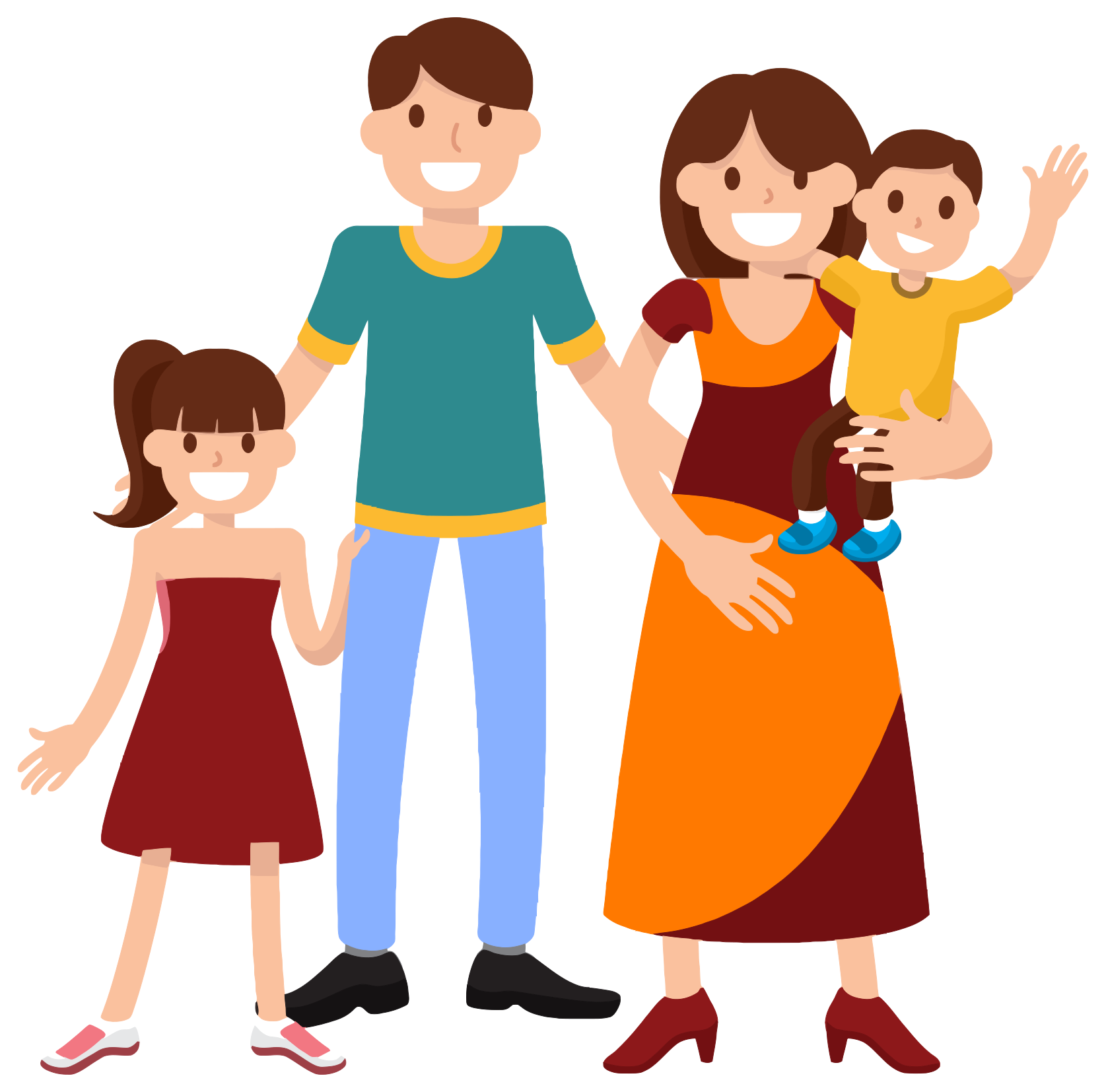 This features a family of four, consisting of two adults and two children. They are all standing together in front of each other, posing for the picture. The man is wearing a green shirt while the woman has an orange dress on. The children are also dressed up, with one child wearing blue shoes. The family appears to be happy and enjoying their time together as they pose for this special moment. They seem to be in a comfortable environment, possibly at home or during a family outing. Overall, the image captures a warm and loving family moment.