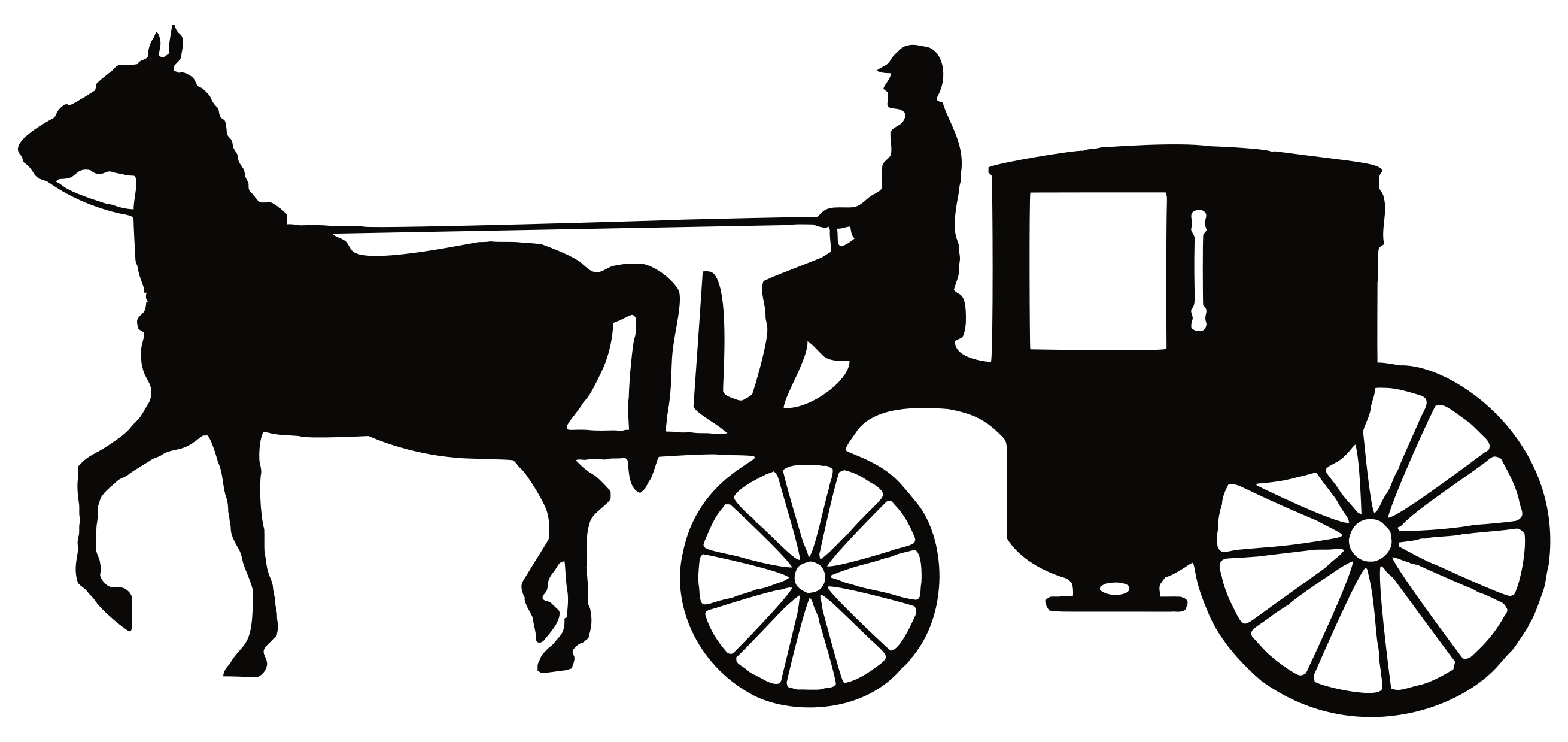 This features a black and white drawing of a horse-drawn carriage with a man riding in it. The horse is positioned on the left side of the scene, while the carriage occupies most of the right side. The man appears to be enjoying his ride as he sits comfortably inside the carriage. This artistic representation captures the essence of a bygone era when horse-drawn carriages were a common mode of transportation.