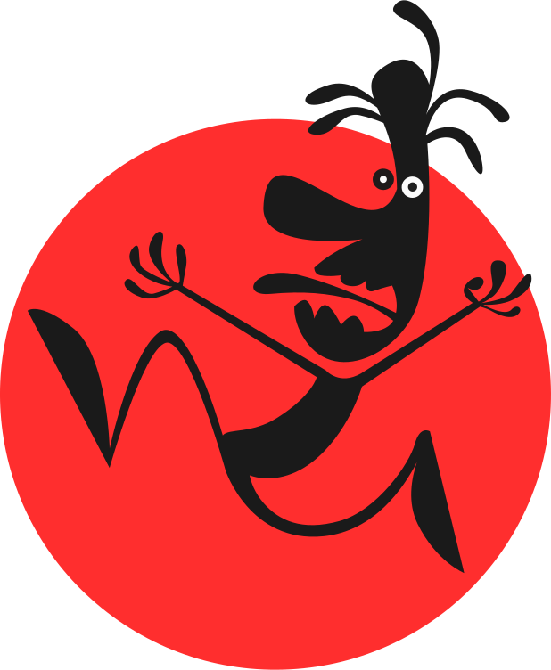 This features a red circle with a black and white cartoon character inside of it. This character is depicted as having an exaggerated mouth, making it appear to be yawning or screaming. The character's arms are stretched outwards, giving the impression that it is running or jumping. The overall design gives off a playful and fun vibe, likely intended for entertainment purposes.