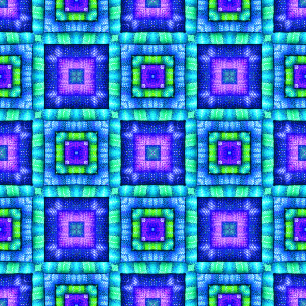 This features a large, intricate pattern made up of many small squares. Each square is filled with a vibrant color, including shades of blue and green. The overall effect creates an eye-catching and visually appealing design that covers the entire frame. This unique pattern could be used for various purposes such as wallpaper or fabric designs, adding a touch of creativity and style to any space it adorns.