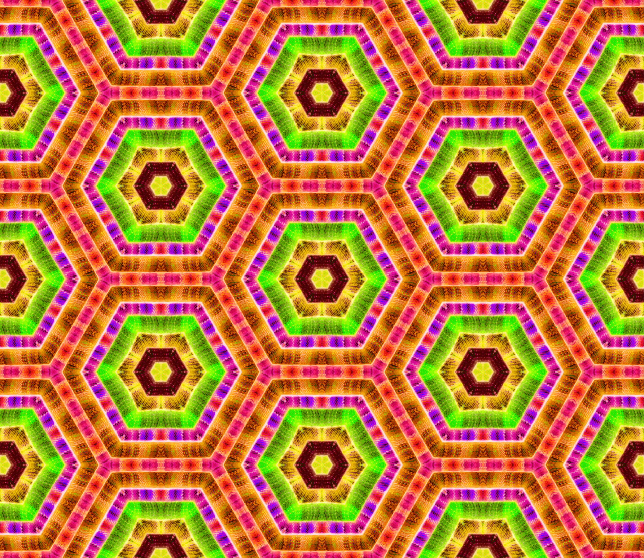 This features a vibrant and colorful pattern of hexagons, each with a different color. There are at least 13 distinct colors visible in the pattern, creating an eye-catching and lively design. The hexagons are arranged in various orientations, giving the pattern a dynamic and engaging appearance. This unique and visually appealing design could be used for various purposes such as wallpaper or fabric patterns, adding a touch of color and creativity to any space.