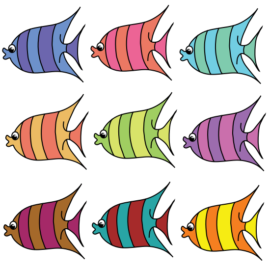 This features a collection of fish in various colors and sizes. There are ten different fish displayed, each with unique characteristics such as size, shape, and color. Some of the fish have long tails while others have shorter ones. They are all arranged in an organized manner, creating a visually appealing display. This artistic arrangement showcases the diversity and beauty of these fish, making it an interesting and engaging image for viewers to appreciate.