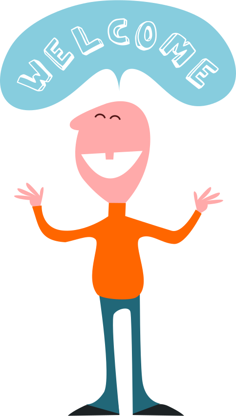 This features a cartoon character with an orange sweater and blue jeans, standing in front of a sign that reads "welcome." Above the character's head is a cloud-like text bubble that says "welcome," emphasizing the warm greeting. The character appears to be smiling, adding a friendly atmosphere to the scene. This image could be used for various purposes such as advertising or promoting an event, as it conveys a welcoming and approachable message.