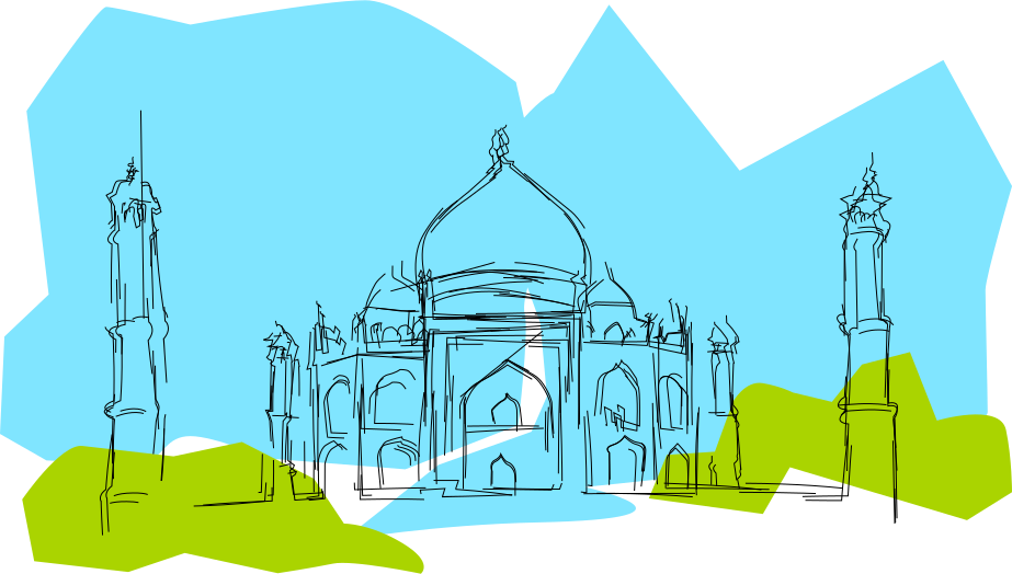 This is a hand-drawn sketch of the Taj Mahal, an iconic and historical monument located in India. The Taj Mahal was built by Mughal Emperor Shah Jahan as a memorial to his beloved wife Mumtaz Mahal. This beautiful white marble mausoleum stands tall against a blue sky, showcasing its architectural beauty. The sketch captures the essence of this magnificent structure and its surroundings, making it an appealing representation of the Taj Mahal's charm.