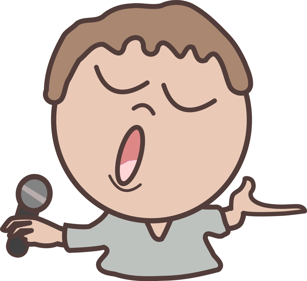 This features a cartoon man with an exaggerated head, wearing a gray shirt and holding a microphone in his hand. He appears to be singing karaoke, possibly at a party or event. His mouth is open wide as he sings, giving the impression of being passionate about his performance. The cartoon character's facial expression and body language convey a sense of excitement and energy, making it an entertaining scene for viewers.