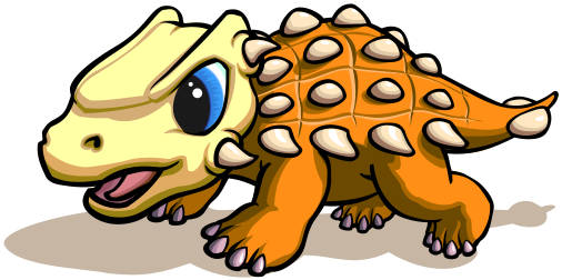 This features a cartoon dinosaur, specifically a baby t-rex, standing on its hind legs. It has an orange color with white spikes on its back and a white head with blue eyes. The dinosaur appears to be walking towards the viewer, giving it a sense of motion. This illustration is likely meant for entertainment or as part of a children's book or game.