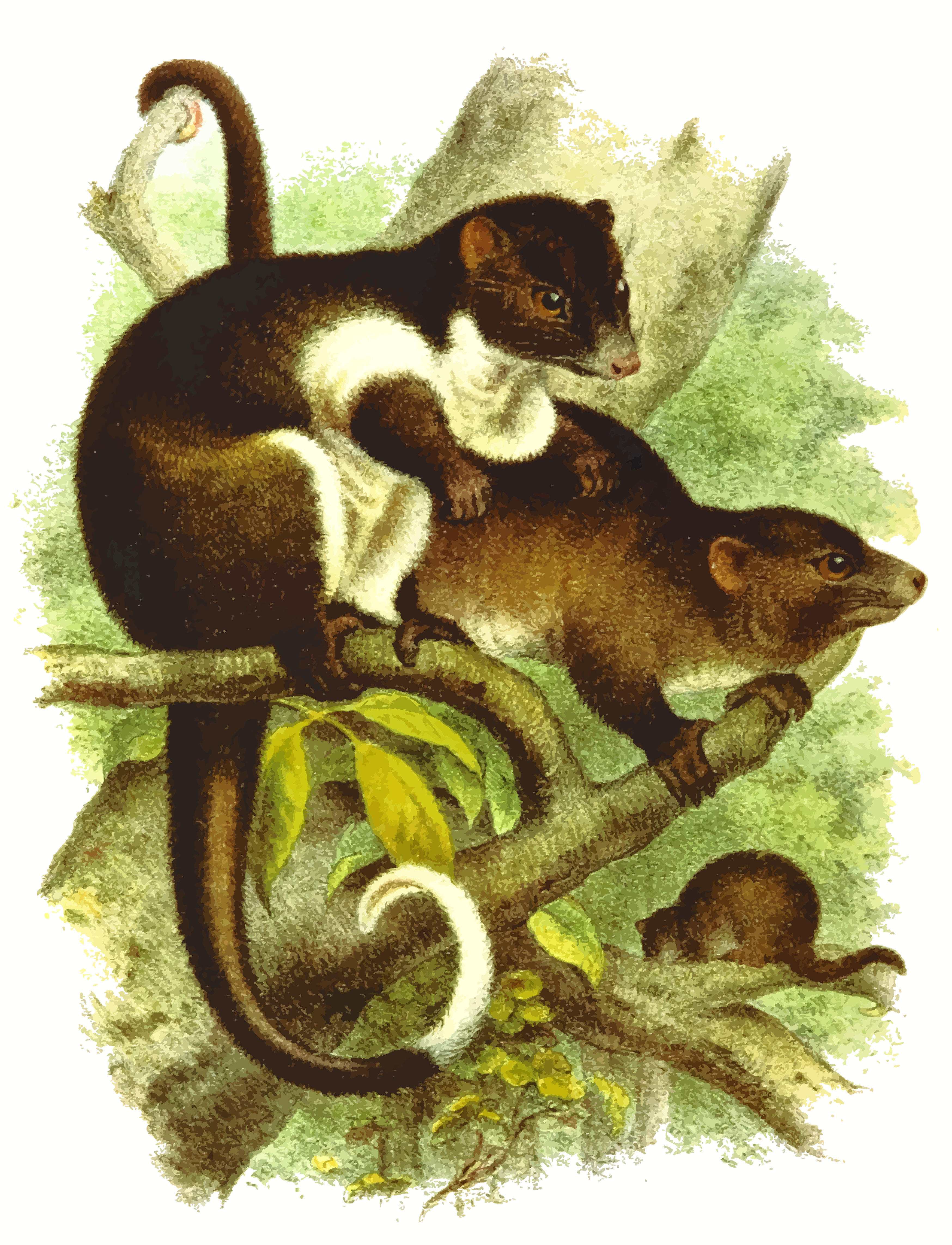 This features a beautifully drawn illustration of two small mammals, possibly squirrels or rodents, sitting on top of a tree branch. They are positioned close to each other and appear to be enjoying their time together in the tree. The scene is set against a backdrop of leaves, creating an atmosphere of nature and tranquility. The intricate details of the animals' fur and facial features make this illustration truly captivating and visually appealing.