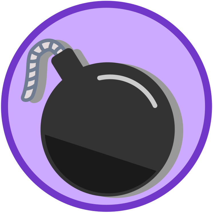 This features a purple circle with an illustration of a bomb inside. The bomb is depicted as having a long handle, giving it the appearance of a grenade or a similar type of explosive device. The overall design of the circle and the bomb gives off a sense of danger and caution.