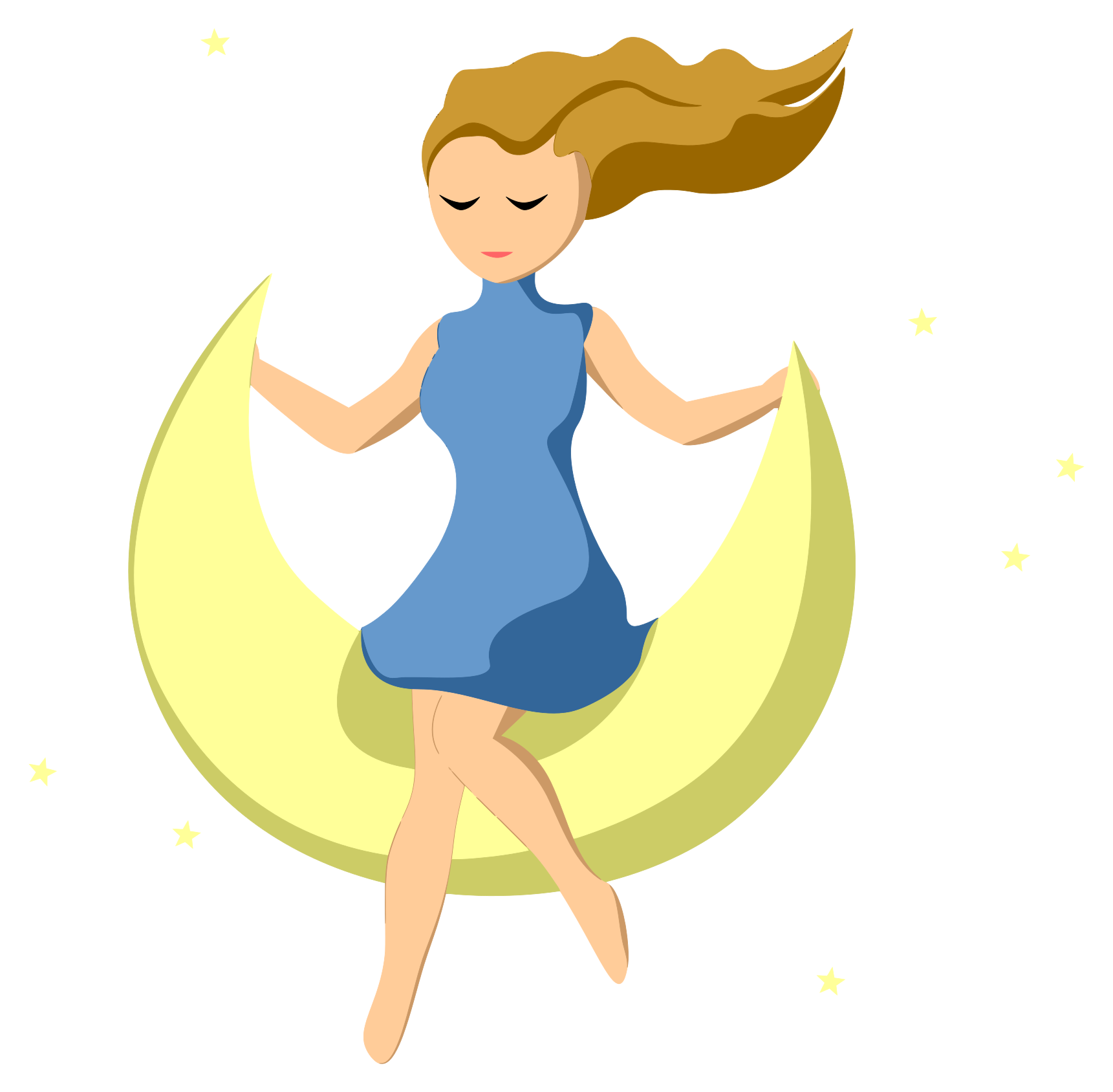 This features a woman in a blue dress, sitting on top of the moon. She appears to be floating or flying through the air as she sits on the celestial body. Her hair is blowing in the wind, adding an element of motion and dynamism to the scene. The woman's outfit and her position on the moon create a sense of whimsy and fantasy, making it an interesting and eye-catching image.